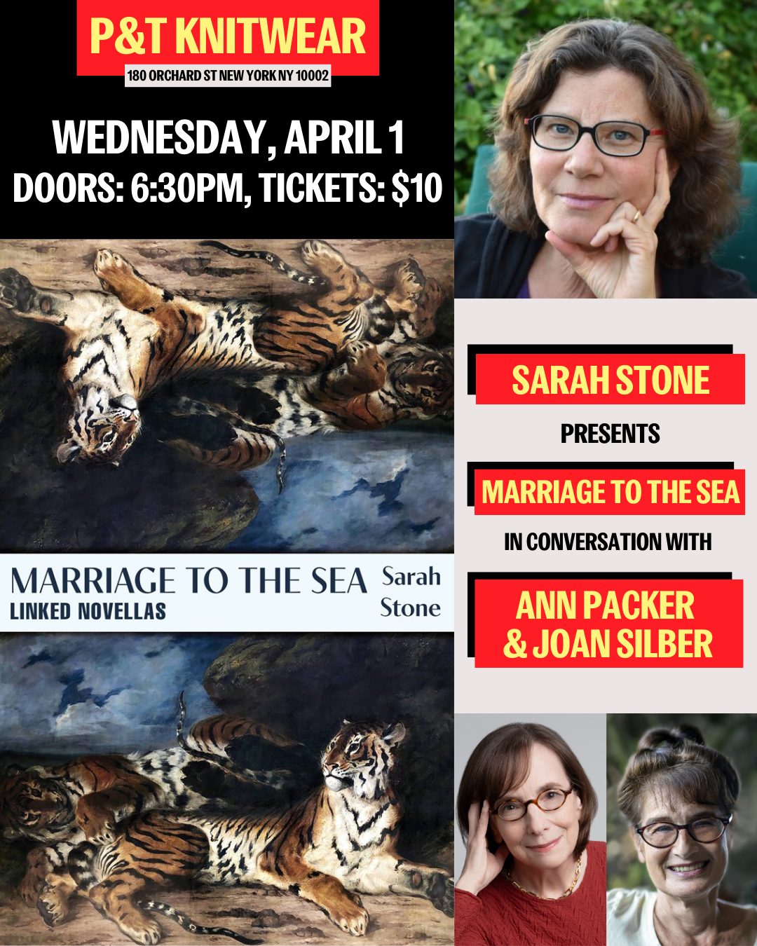For those who can join us in New York City: “Sarah Stone presents Marriage to the Sea, with Ann Packer & Joan Silber,“ East Coast book launch: in-person reading and conversation, P&T Knitwear Books & Podcasts, Wednesday, Apr 1. from 6:30 pm to 8 pm. More info and tickets here.