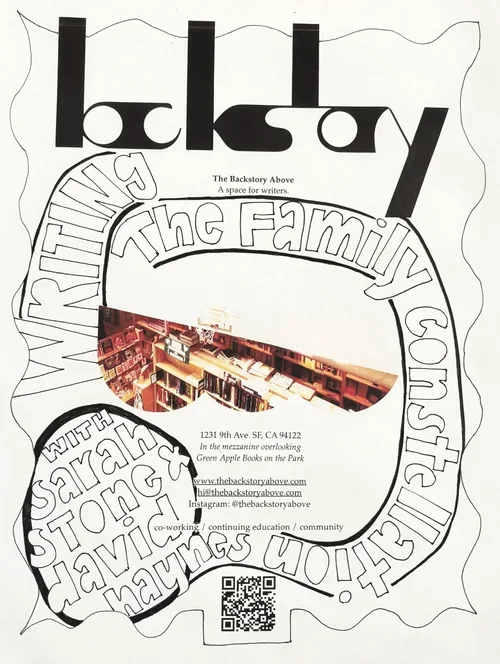 The next day, Friday March 20 from 2:30 to 5 pm David and I are teaching a class, also at The Backstory Above, on Writing the Family Constellation. Here’s our description: Families are full of constantly shifting dynamics and allegiances: feuds and friendships; competing interests, needs, and desires; disputed histories and circumstances. All of these become part of our projects, whether we’re writing a family saga that covers generations, a work that focuses on one relationship, or a piece that takes place over the course of an afternoon. This session is for writers at all levels and working in any genre, including fiction, essay, memoir, poetry, and plays. We’ll read short selections together, discuss the craft and process of writing families, and do a couple of writing exercises to explore family constellations from different angles. Along the way we’ll think about who gets included and how (are they central or peripheral?) and whether the piece stays with one speaker/central character or shifts among different consciousnesses and perspectives. We’ll also touch on the dynamics around writing family that happen off the page and the critical importance of dramatic irony when traversing the family multiverse. Please bring a pen and notebook or a laptop. Register here for the class.