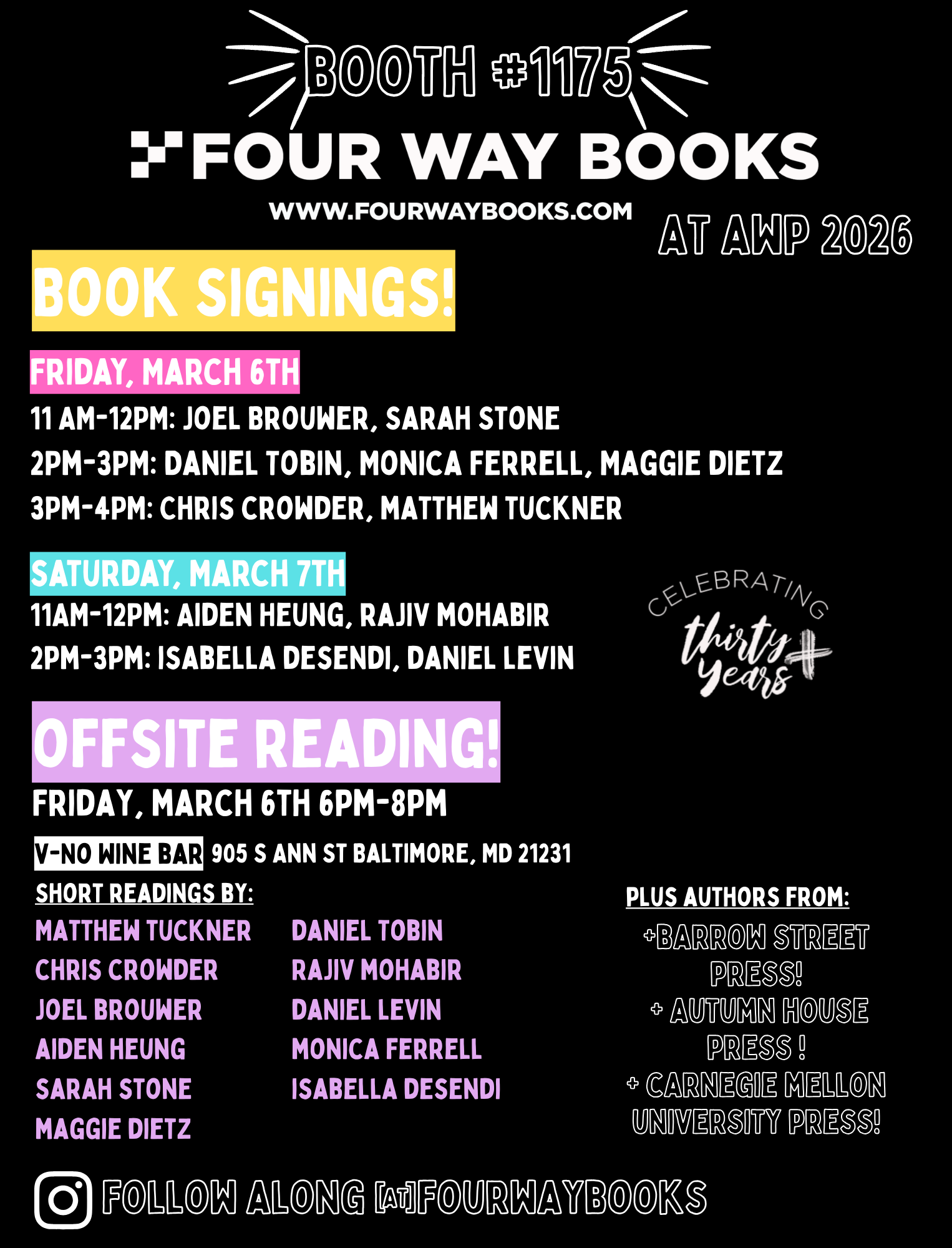 After AWP, I’m part of a virtual launch for Four Way Books: The Norwich Bookstore, Wednesday March 18, 4 pm PT (7 pm ET.), “Sarah Stone, Daniel Tobin, Daniel Barban Levin, Aiden Heung - A Virtual Evening With Four Way Books.” More information and registration here.